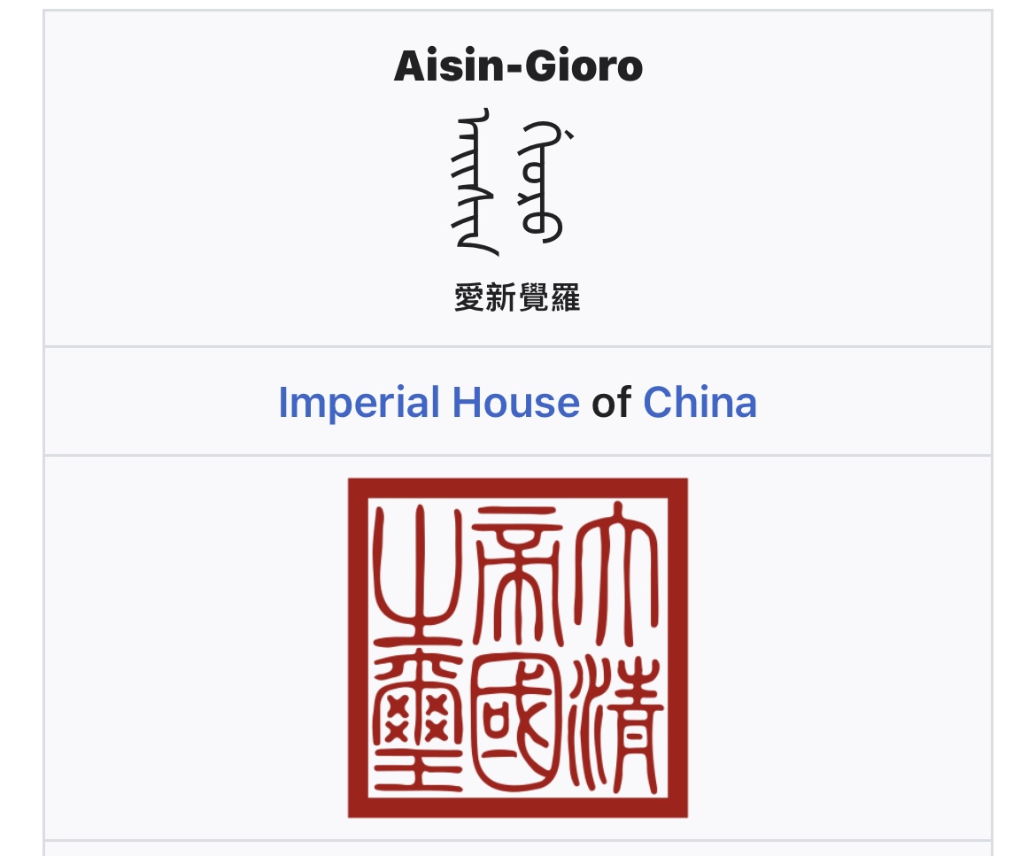 Emblem showing the Manchu script logo of the Aisin-Gioro family and the red Great Qing Imperial Seal representing Chinese imperial heritage