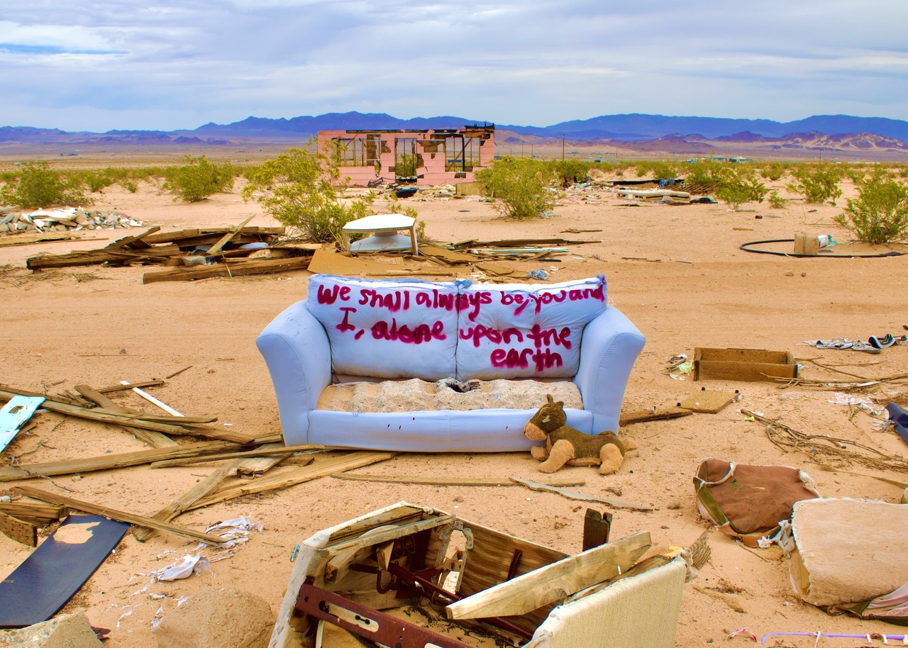 At the heart of Abandoned is a partially rebuilt “Jackrabbit Homestead,” modeled after the modest cabins scattered across the California desert—remnants of the Small Tract Act of the 1950s and 60s, a federal homesteading initiative that offered five-acre parcels to anyone willing to build. For many, the dream of desert independence collapsed under harsh conditions, leaving behind empty shells of promise. Marks reconstructs one of these structures inside the gallery: graffiti-marked exterior walls, discarded furniture, and fragments of domestic life weathered by sun and time. With projected desert sunsets, recorded soundscapes, and weathered artifacts, Marks invites viewers into a multi-sensory environment where memory, impermanence, and survival collide.