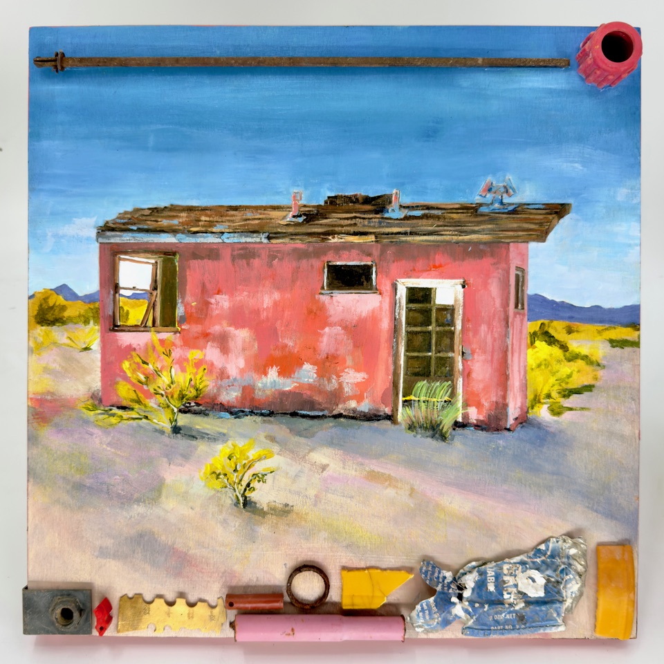The installation is flanked by photographs of abandoned Jackrabbit cabins and mixed-media panels that combine painted imagery of derelict vehicles with objects Marks gathered near these sites. Together, they capture the stark beauty and quiet sorrow of the desert’s fragile monuments. Rusted hinges, scorched metal, and fragments of glass and cloth become contemporary reliquaries of the Mojave’s discarded narratives. For Marks, Abandoned is both personal and universal. The exhibition expands her longstanding interest in psychological landscapes and the human tendency to leave traces—whether physical, emotional, or societal. With a master’s degree in Marital and Family Therapy and a specialization in Clinical Art Therapy, Marks brings a nuanced understanding of the emotional underpinnings of neglect, loss, and transformation.